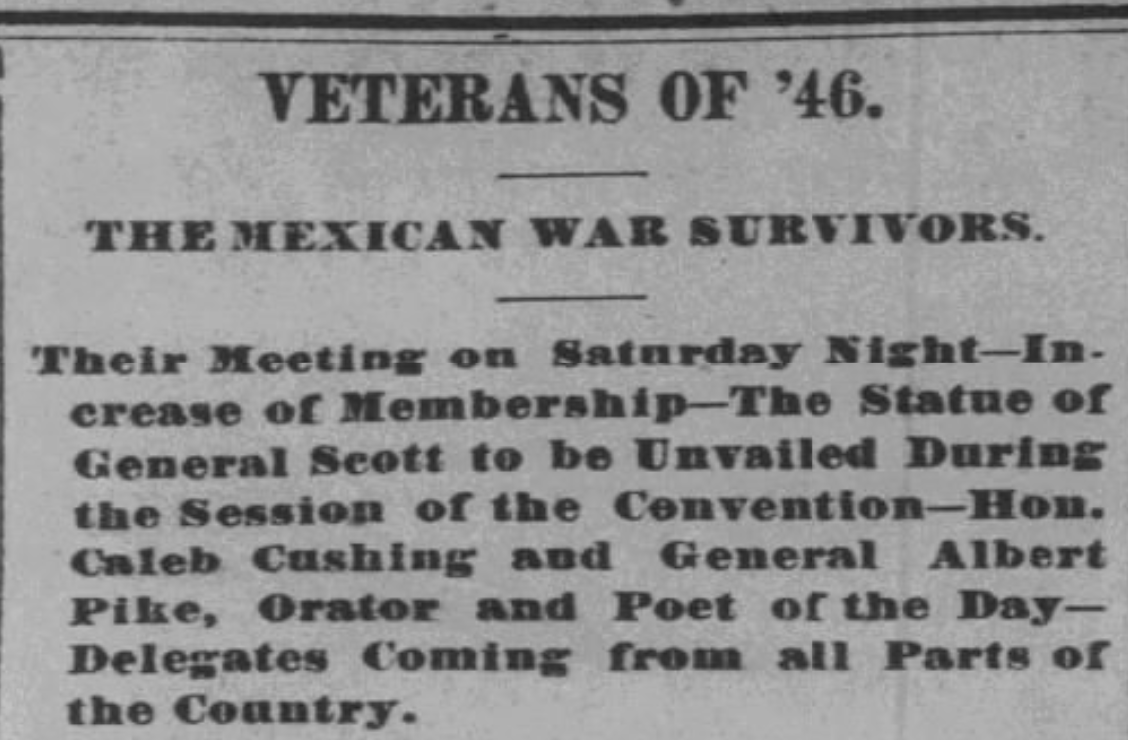 Their relationship became visible to the public in the winter of 1873-1874. In January 1873, the Daily Arkansas Gazette reported on a United States Senate election in Arkansas in which a Mr. Cunningham, explaining his vote, described the kind of statesman he believed the Senate deserved, "a name that stood alongside that of Reverdy Johnson, Albert Pike and Caleb Cushing," men who "in better days had adorned the state in the national council.” One year later, the two were to appear together as the featured speakers at a convention of the Associated Veterans of 1846, the organization of Mexican War veterans, held at the Masonic Temple in Washington D.C. The Washington Chronicle announced that Cushing would deliver the oration and Pike would read an original poem. The Council Bluffs Weekly Nonpareil confirmed the pairing: "These two will take a leading part in the ceremonies, Caleb Cushing delivering an address to the veterans, while Albert Pike will read an original poem." The convention planned to proceed from the Masonic Temple to the White House to pay its respects to the President.